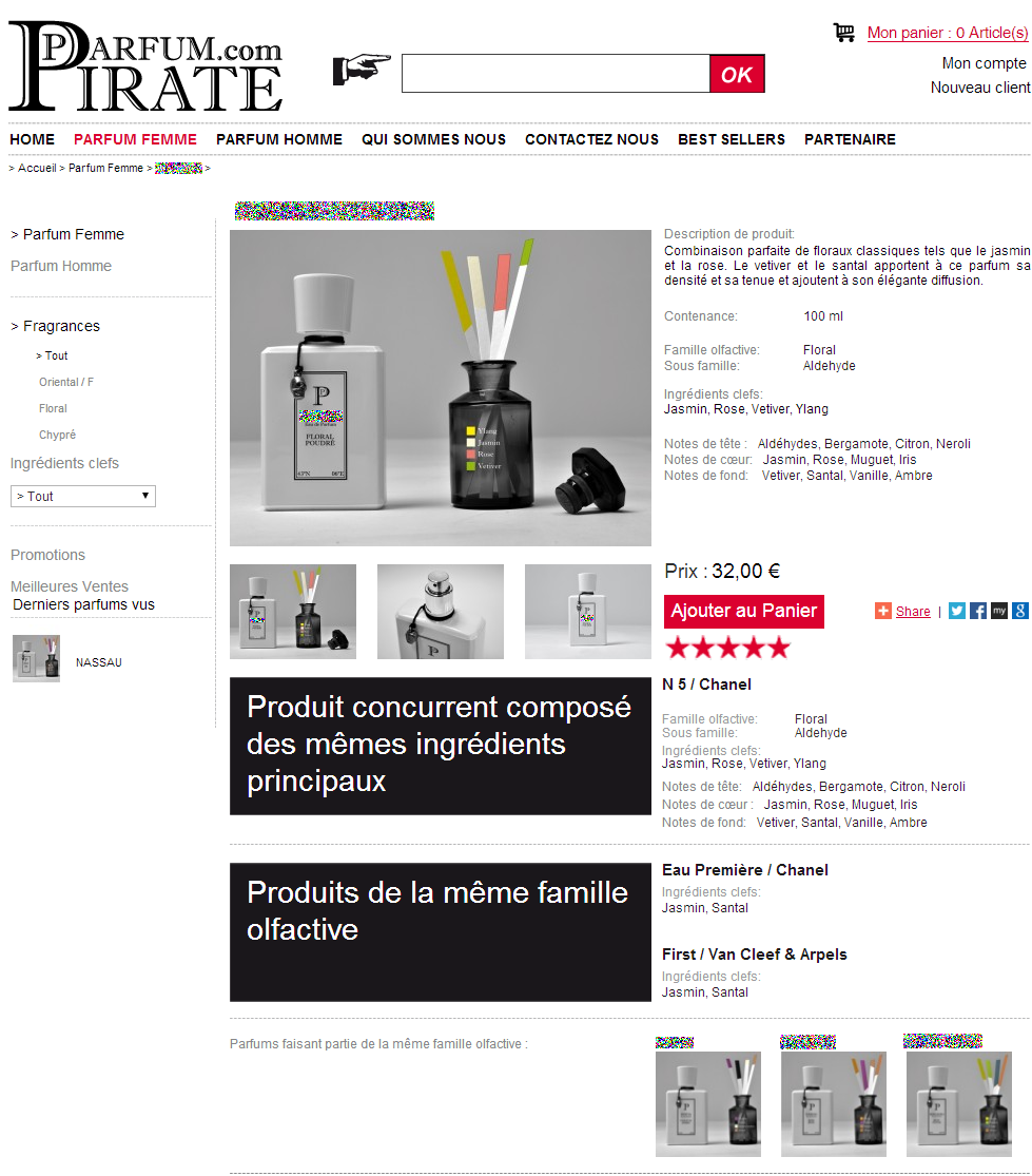 • en entrant le nom d’un parfum de grande marque, son moteur de recherche mène à la fiche d’un parfum sur lequel est indiqué le nom d’un « produit concurrent composé des mêmes ingrédients principaux ».